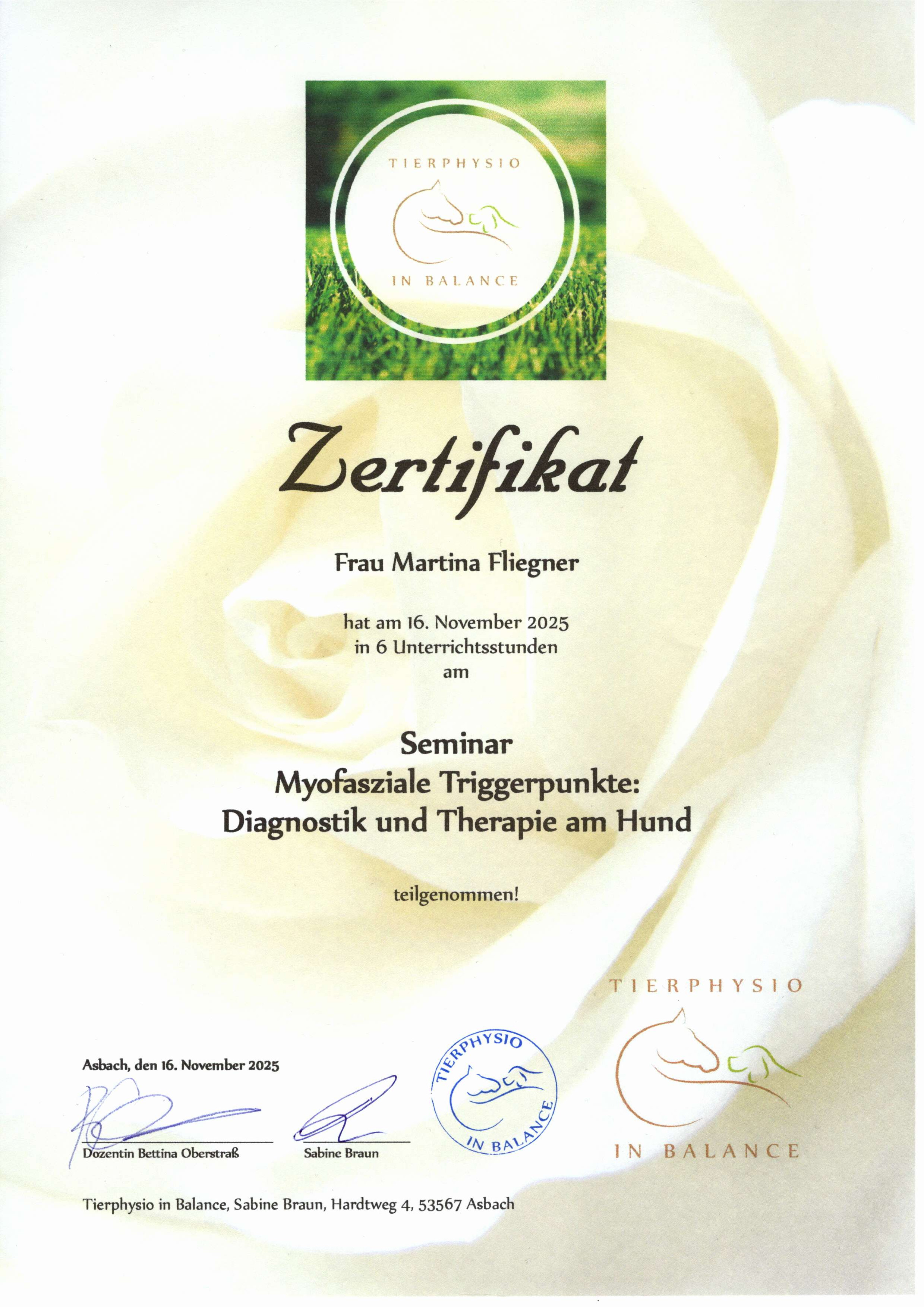 Basis meiner Tätigkeit ist die Ausbildung zur Hundephysiotherapeutin nach Blümchen. Das Ergebnis der Prüfung findet ihr hier als Zeugnis und die Dokumentation der bestandenen Prüfung liegt als Zertifikat vor.